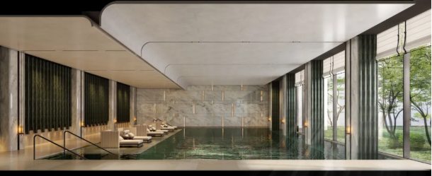 其中无边恒温泳池,配备休憩区、更衣室、淋浴间等,居者可晨昏锻炼,可阖家共乐,可四季畅游,感受身心的如鱼得水。