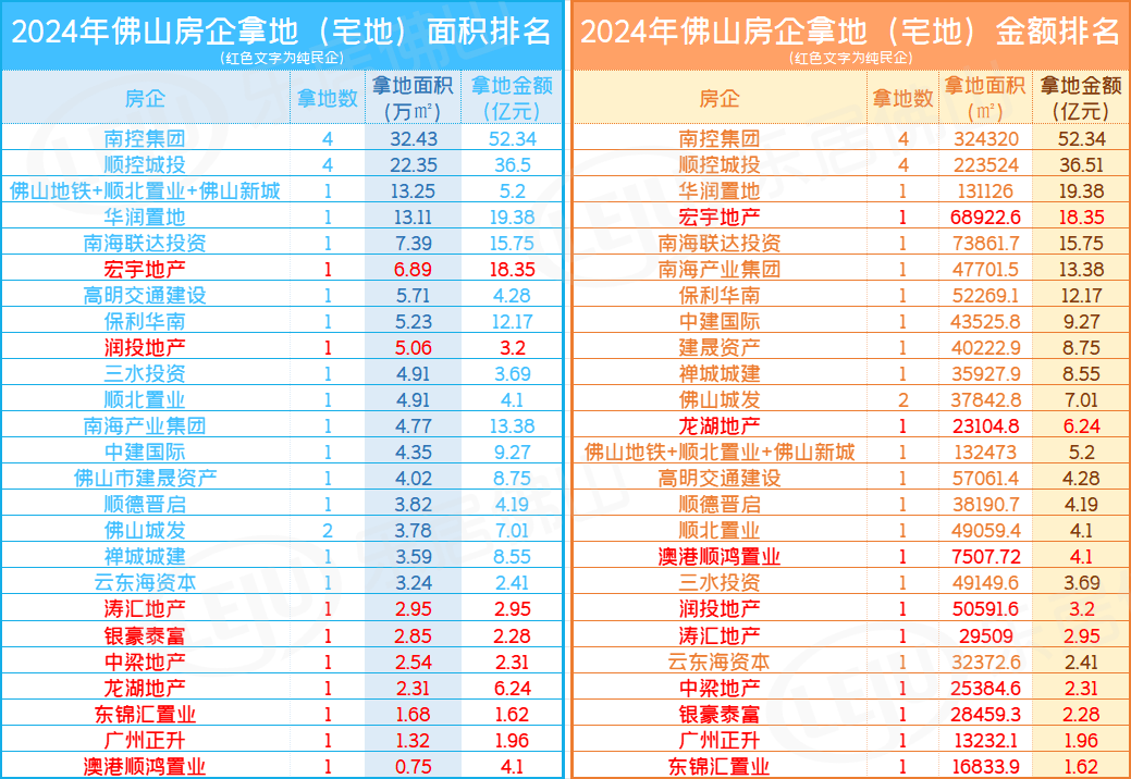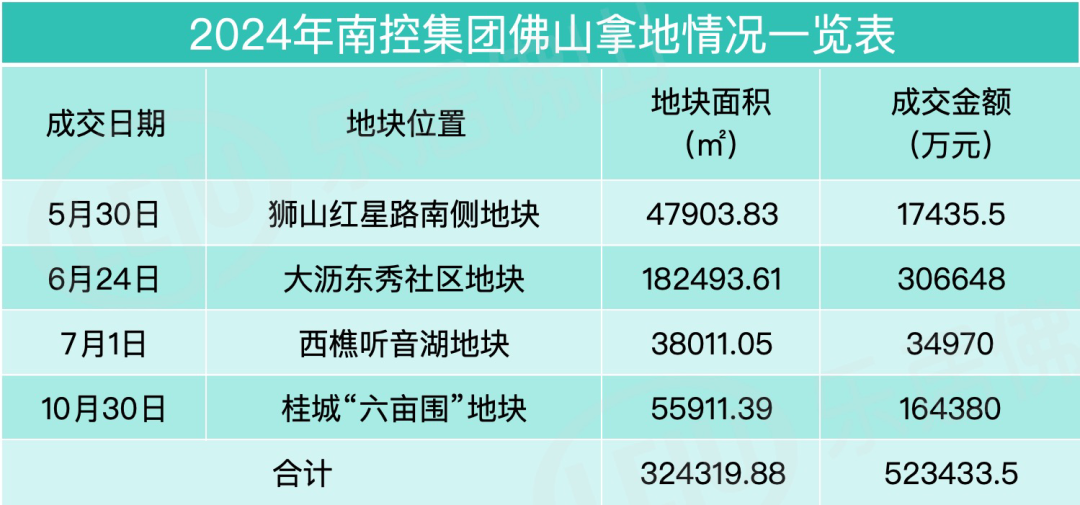 仅宅地来说,南控集团以32.4万㎡的拿地面积和52.34亿元的拿地金额稳坐2024年佛山大地主。