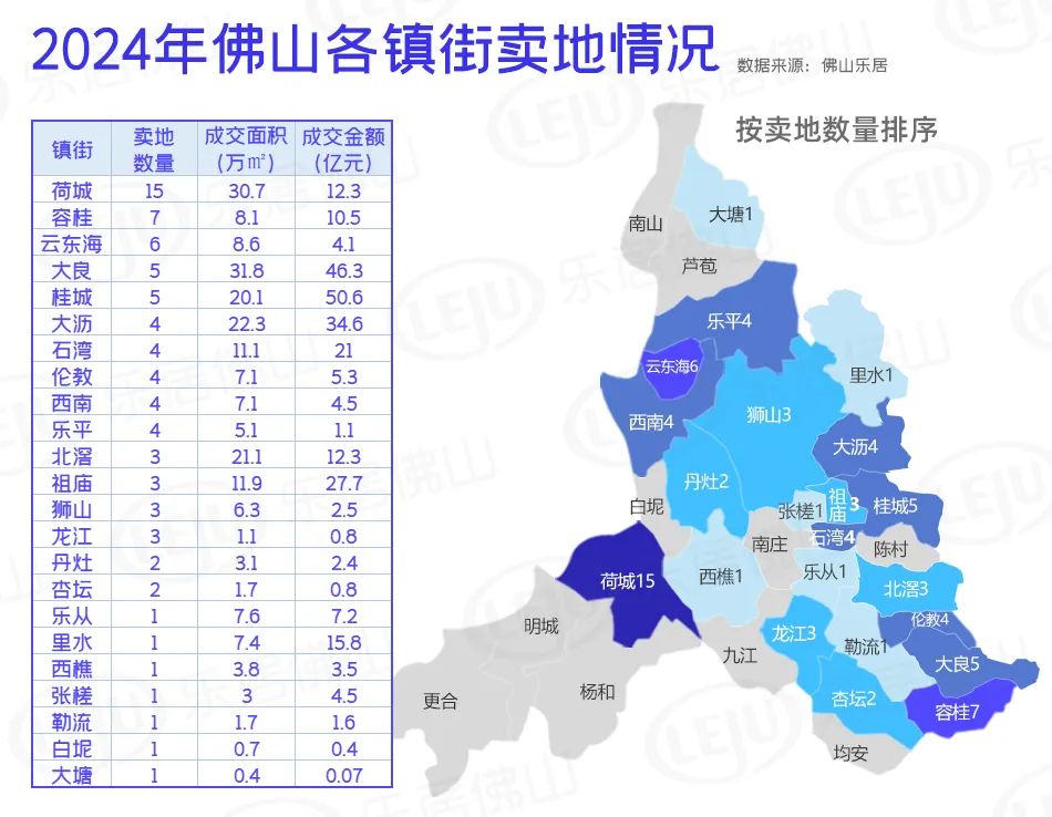 值得一提的是,荷城在成交面积上虽以30.73万㎡稍稍落后于大良,而在成交宗数上,其15宗的绝对数量毫无疑问成为了佛山2024年卖地数最多的镇街。