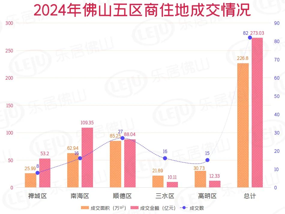 据乐居不完全统计,佛山2024年全年共出让商住地总计82宗,出让总面积约226.8万㎡,同比去年大涨36.5%;出让总金额约264.63亿元,同比去年却跌了21%。