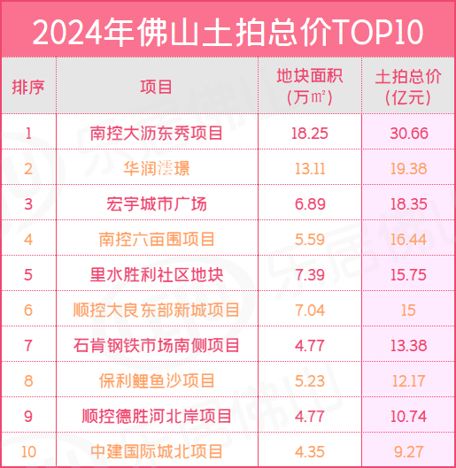 总价方面,突破10亿元的地块总计有9个,其中南控的大沥东秀项目更是直接以30.66亿元摘得2024年佛山土地总价地王!