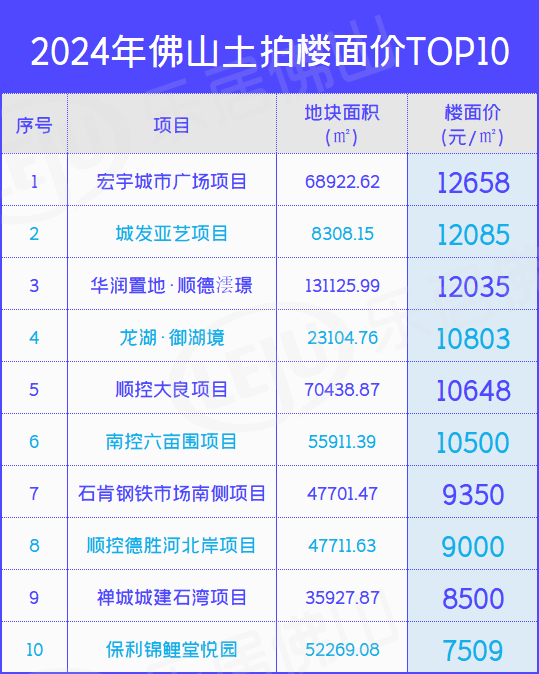数据显示,宏宇城市广场地块为2024年佛山单价地王,成交楼面价12658元/㎡。