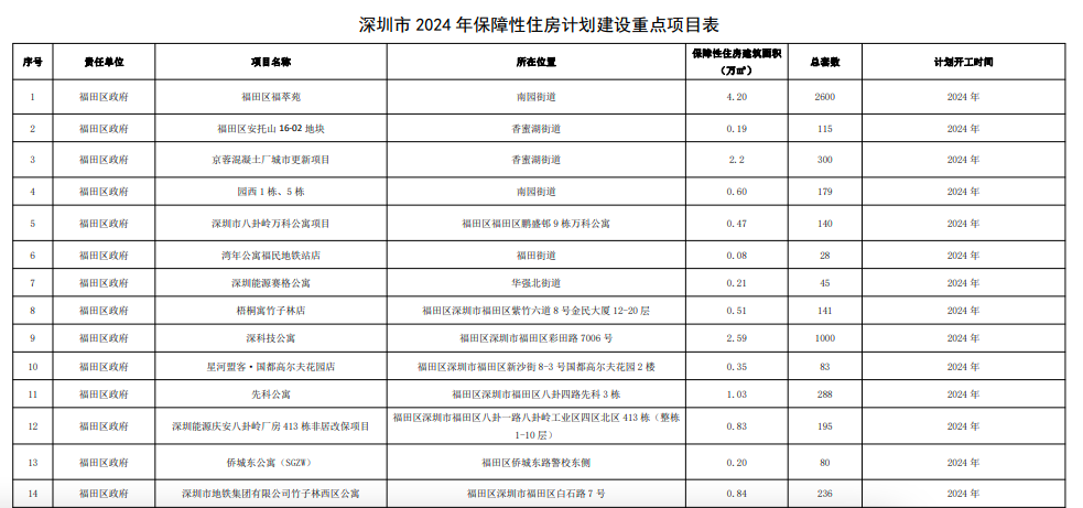 南山区18个项目,9476套房;其中,南山建工村 05-02 地块公共住房项目1400套房,南山智造红花岭产业园一期配套宿舍(第二批)1380套房,安居高新花园项目 A 1008套房;