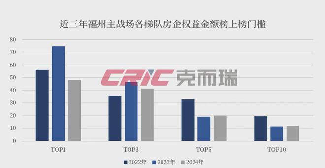 近两年以来,在行业深度调整之下,房企格局分化持续,央国企销售表现显著好于民营房企。从榜单来看,除了前三强房企外,其他各梯队房企的门槛逐年降低。仍以福州主战场权益金额榜为例,2024年TOP1、TOP3、TOP5、TOP10房企的门槛均有不同程度的下滑,细数近三年以来销售排行榜上榜门槛,TOP1、TOP3、TOP5、TOP10变化如下: