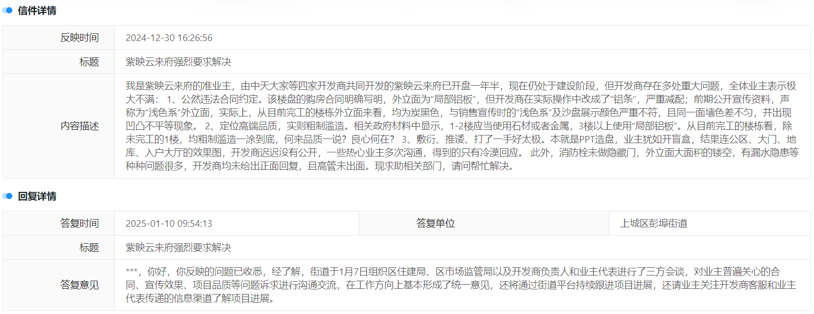 对此,上城区彭埠街道回复称,街道于1月7日组织区住建局、区市场监管局以及开发商负责人和业主代表进行了三方会谈,对业主普遍关心的合同、宣传效果、项目品质等问题诉求进行沟通交流,在工作方向上基本形成了统一意见,将通过街道平台持续跟进项目进展,请业主关注开发商客服和业主代表传递的信息渠道了解项目进展。