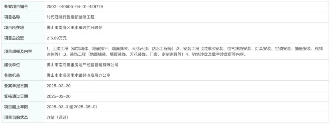 根据备案资料显示,该装修工程总计215.89万元,装修内容将包含售楼部的土建、安装、一级销售沙盘等内容,建设时限从3月1日至5月1日。
