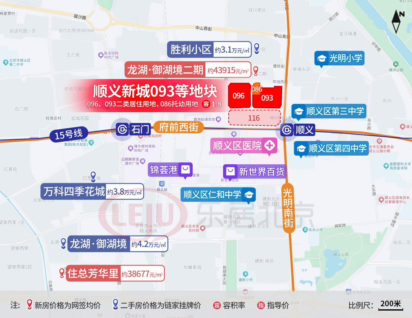 地块北侧是新房龙湖·御湖境二期,目前网签均价约4.39万元/㎡,南侧116地块为商业用地,与住宅用地同日出让,由北京国泰东风商城有限公司竞得,未来将打造地标性商业。
