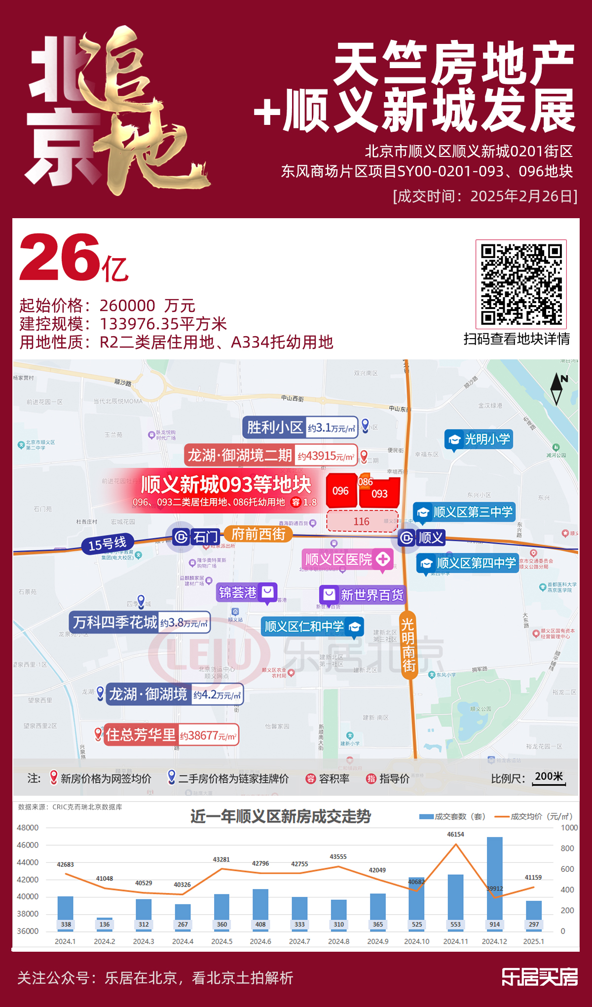 2月26日,北京市顺义区顺义新城0201街区东风商场片区项目SY00-0201-093、096地块竞价截止,仅北京天竺房地产开发有限公司和北京顺义新城发展有限公司联合体一家企业报名并报价,最终由北京天竺房地产开发有限公司和北京顺义新城发展有限公司联合体以26亿元底价竞得该宗地,住宅楼面价约2万元/㎡。
