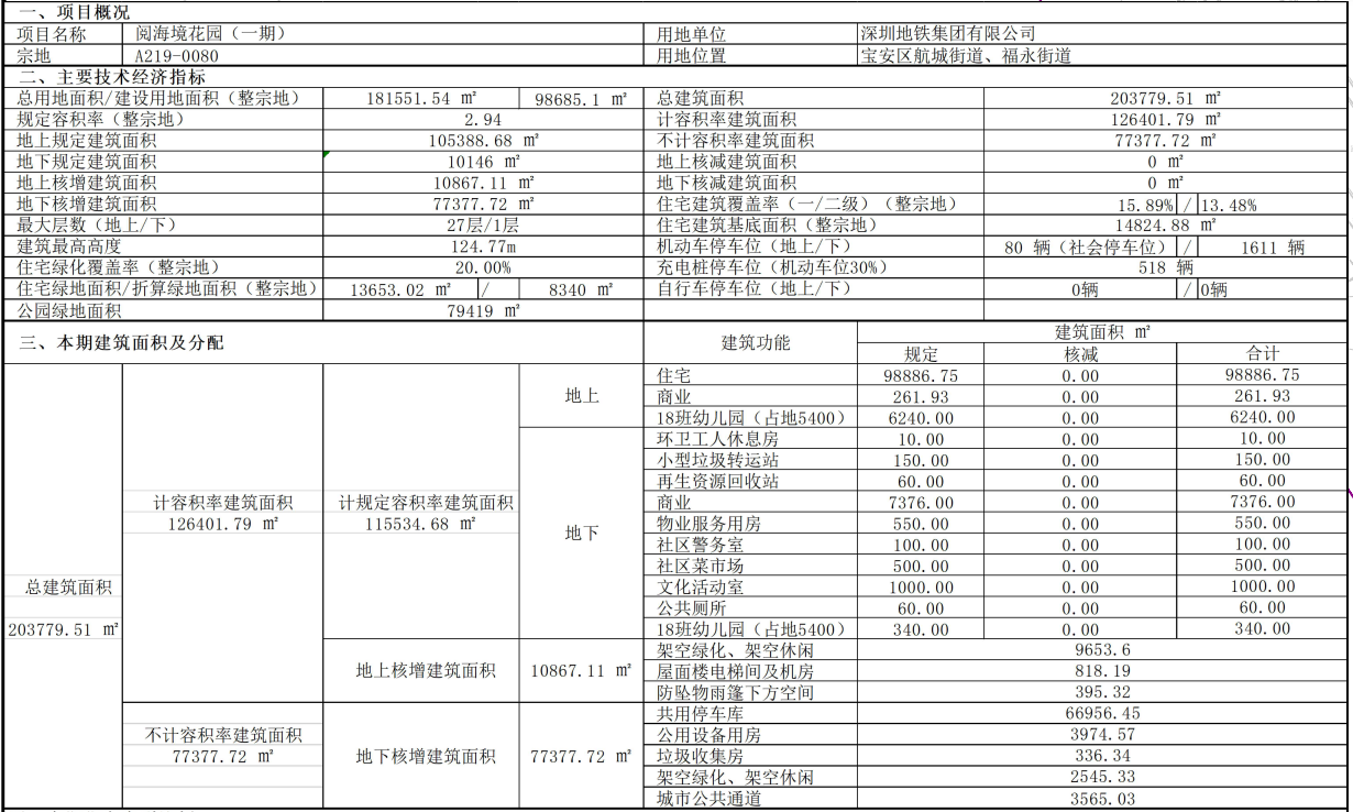 阅海境花园,横跨宝安区航城街道、福永街道两个街道,土地面积181551.54平方米,总建筑面积289854平方米,容积率为1.6,土地用途为“二类居住用地+公园绿地+交通用地”。