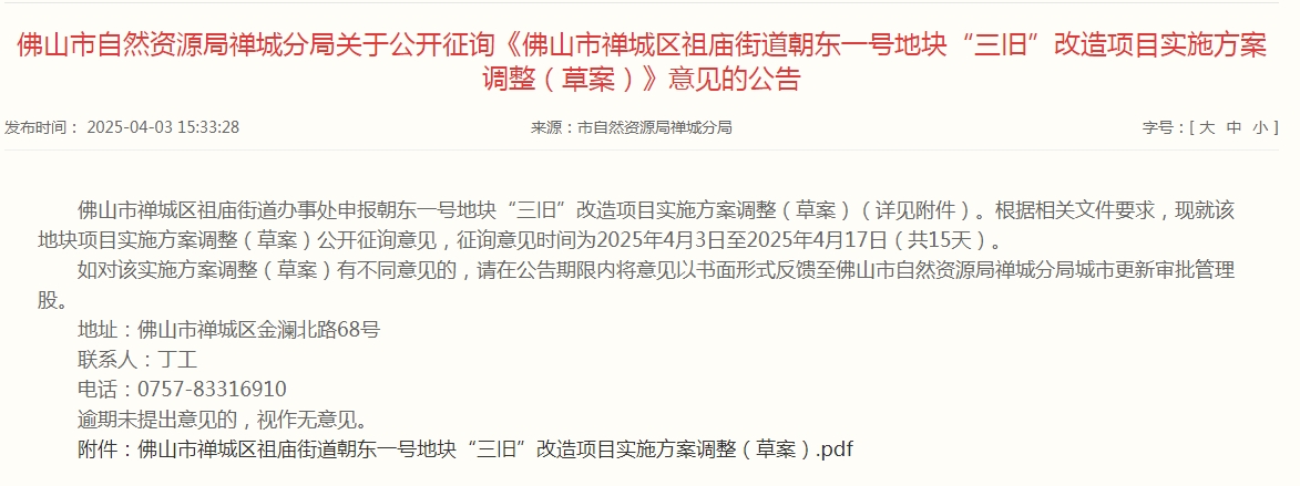 4月3日,禅城区政府网站发布了关于公开征询《佛山市禅城区祖庙街道朝东一号地块“三旧”改造项目实施方案调整(草案)》意见的公告,征询意见时间为2025年4月3日至2025年4月17日。