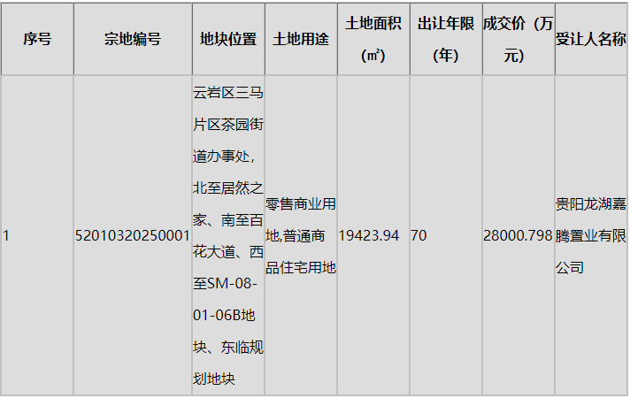 宗地编号为52010320250001的地块,位于云岩区三马片区茶园街道办事处,北至居然之家、南至百花大道、西至SM-08-01-06B地块、东临规划地块,土地用途为普通商品住宅用地和零售商业用地,面积为19423.94平方米,出让年限70年。被贵阳龙湖嘉腾置业有限公司以28000.798万元成交总价摘得。