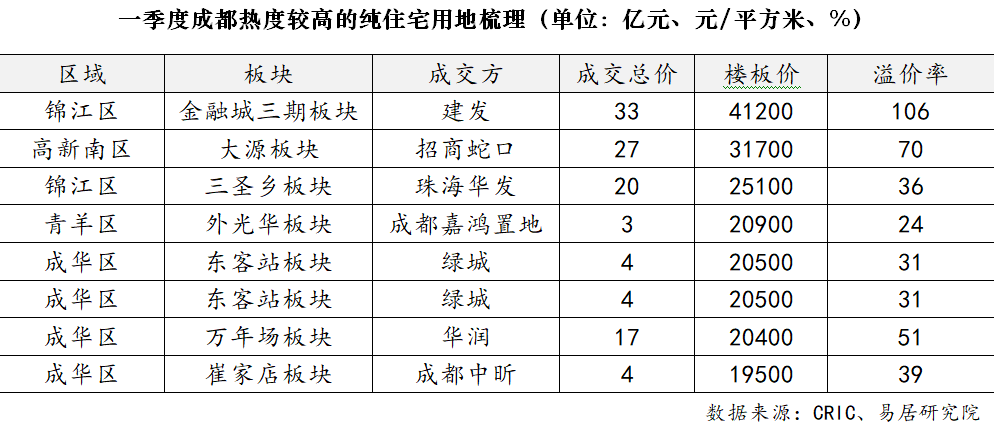 根据易居研究院监测,一季度成都纯住宅用地共成交18幅。其中有7幅地价超过2万元/平方米;8幅土地溢价率超过20%,溢价率最高的则超过100%。