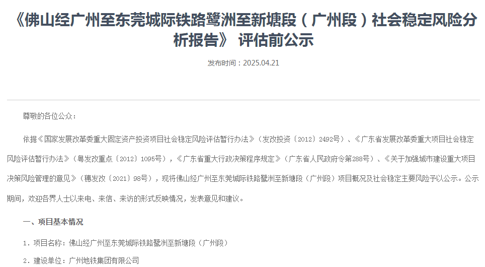 4月21日,《佛山经广州至东莞城际铁路鹭洲至新塘段(广州段)社会稳定风险分析报告》 评估前公示。