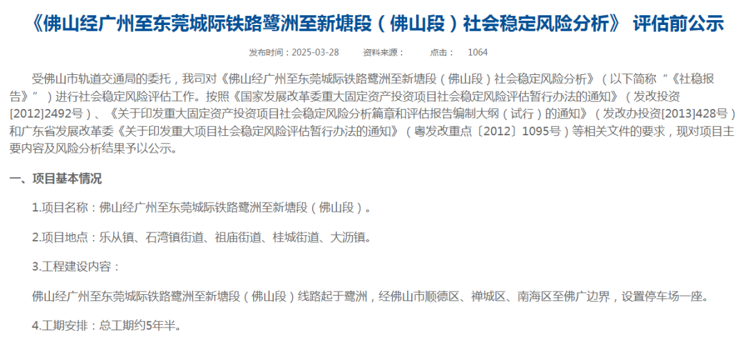 而在3月28日,《佛山经广州至东莞城际铁路鹭洲至新塘段(佛山段)社会稳定风险分析》 已发布评估前公示。