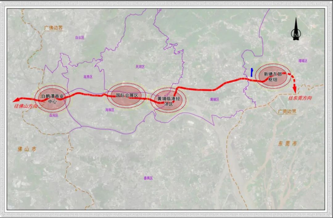 佛山经广州至东莞城际铁路鹭洲至新塘段(广州段)线路走向示意图