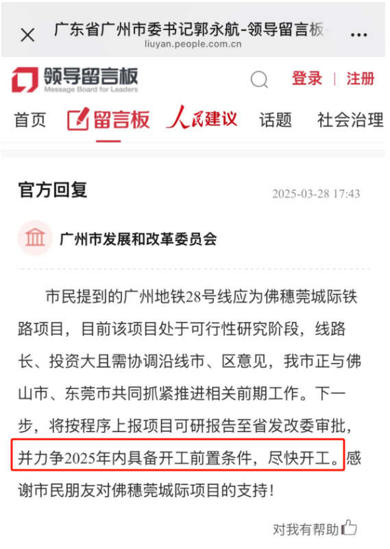 回顾3月28日,广州市发展和改革委员会回应表示:广州地铁28号线应为佛穗莞城际铁路项目,目前该项目处于可行性研究阶段,线路长、投资大且需协调沿线市、区意见,我市正与佛山市、东莞市共同抓紧推进相关前期工作。