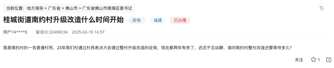 日前,有网友在人民网领导留言板上咨询南约村改造最新进展:我是南约村的一名普通村民,23年我们村通过村民表决大会通过整村升级改造的征询,现在都两年有余了,迟迟不见动静,请问南约村整村改造还要等待多久?