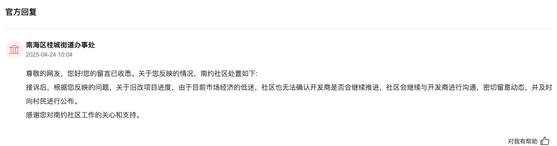 对此,南海区桂城街道办事处回复指出,由于目前市场经济的低迷,社区也无法确认开发商是否会继续推进,社区会继续与开发商进行沟通,密切留意动态,并及时向村民进行公布。