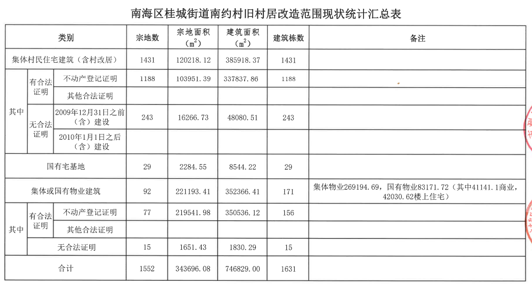 根据资料显示,南约社区整村改造项目涉及土地总计1552宗,宗地面积343696.08㎡,总建面746829㎡,涉及建筑总栋数1631栋。其中,集体村民住宅建筑总计1431栋,国有宅基地29栋,集体或国有物业建筑总计171栋。