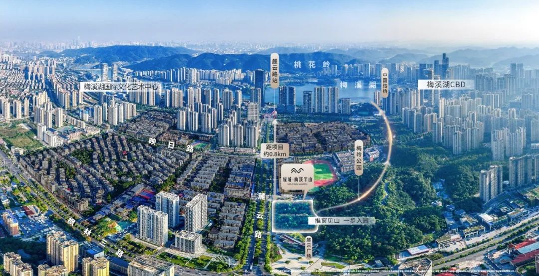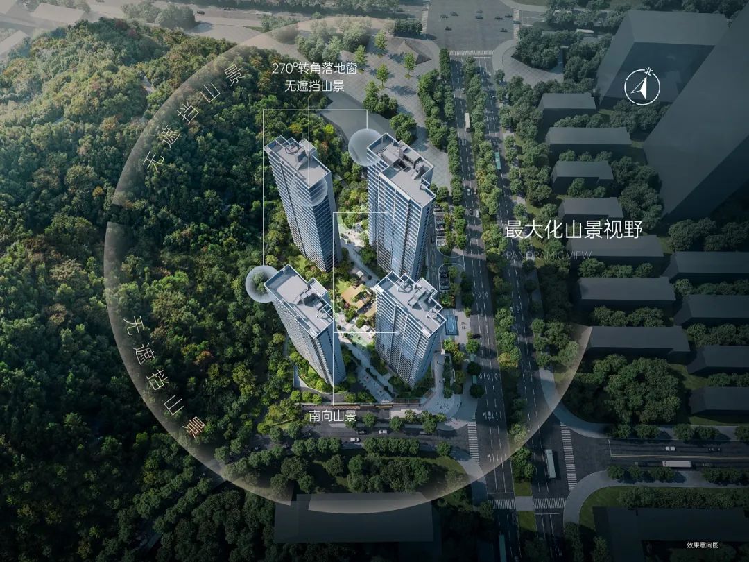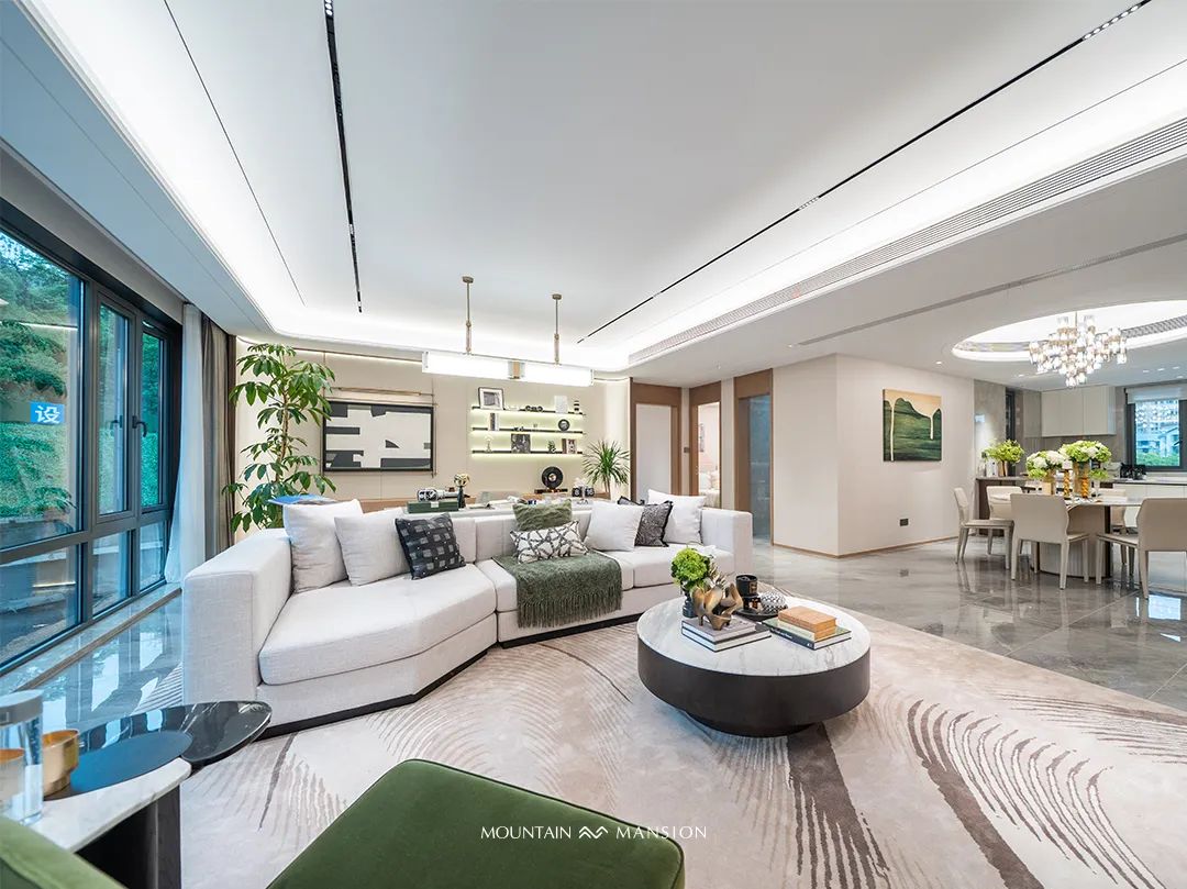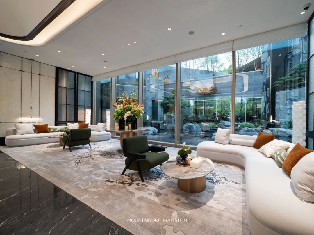 在这个过程中,绿城将理念、资源、审美多重融合。因此在理念上我们可以看到,绿城的“让山居成为一场艺术”, 将山景与建筑共生的理念注入每一寸空间;资源上:项目择址的梅一北岸是片区难得的福祉,1.5km生活圈内涵盖了1个山体公园+1大CBD+3个地铁站+6所品牌学校+8大集中商业,山、园、湖、城万物皆合于此;审美上:经典的绿城Super Flat超平立面,大面积落地玻璃,嵌入横向斜切的金属线条,270°山景转角窗打破室内外边界……