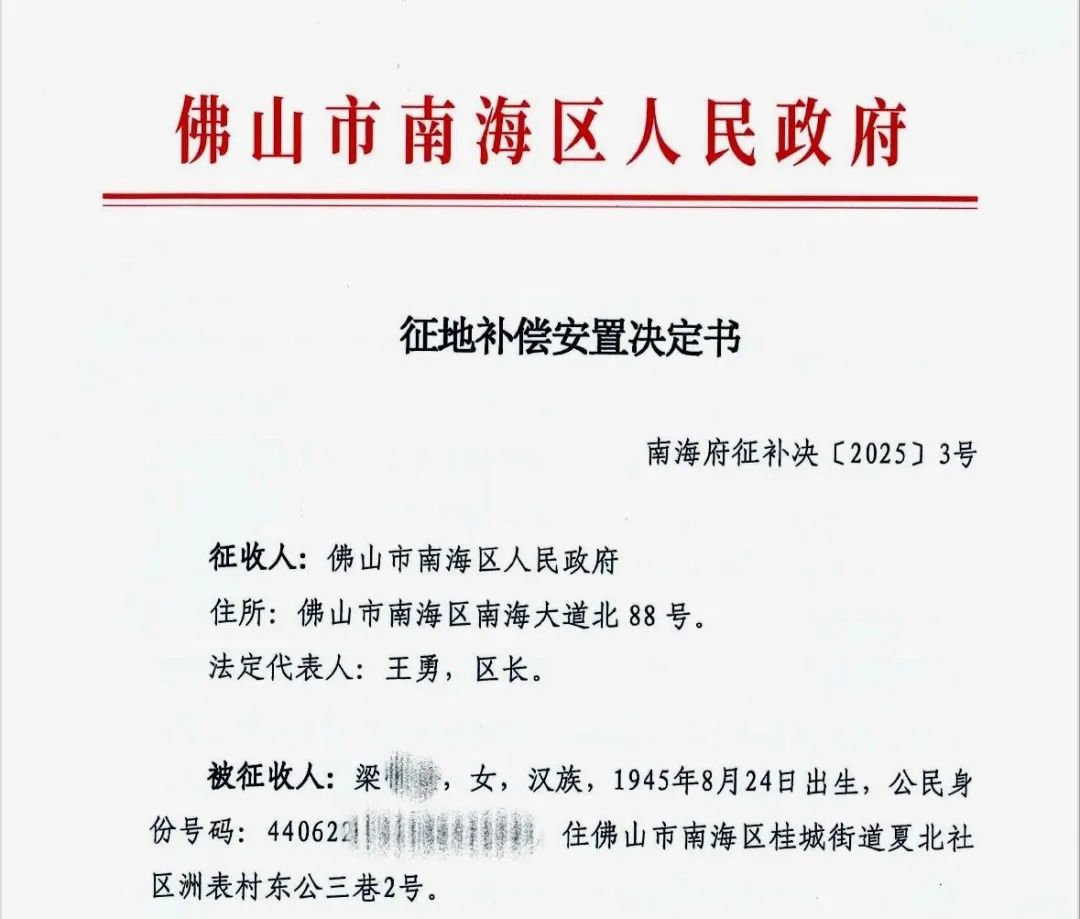 决定书明确,补偿方式及标准与洲表经济社村民表决通过的《土地征收补偿安置方案》《拆迁补偿安置方案》完全一致,未作任何提高。房屋拆除补偿、搬家费、租金补偿等均按方案执行。但因逾期未签约,不享受包括限时签约奖、整体签约奖等签约奖励。其他未签约村民应引以为鉴,尽快签约以避免权益损失。区政府强调,被征收人需在决定书送达后5日内确认补偿方式并签约;10日内提交补偿款收款账号,办理补偿款领取手续,如不办理,相关补偿款由桂城街道公证提存后,视为已完成支付;15日内完成搬迁交房,若拒不履行,将依法强制执行。据了解,洲表旧村居改造项目是南海区重点民生工程,目前首期回迁房12栋在建楼栋已有10栋封顶,部分楼栋即将达到带装修交付状态,小区园林绿化进入施工阶段,首期回迁房预计年内完成交付。但因首期回迁地块上尚有一栋旧村屋未完成签约,导致首期回迁地块上13栋回迁楼栋中的3号楼,无法开工建设。为加快推动首期回迁地块依法征收工作,今年春节期间,超600位洲表街坊,现场签名请愿推动未签约房屋强制征收工作。据洲表经济社此前公开信显示,未完成签约移交的旧村屋房屋具体情况如下:权属人梁某某(实控人为黎某某),土地证面积为110余方,房产证面积为60余方,于2014年重新改建,但无合法手续,存在无证违建情况。旧村屋现状为5层高、毛坯,实测建基面积为150余方,实测建筑面积为810余方。土地占用面积超出土地证40余方,房屋实测面积超出房产证750余方。经多次沟通后,权属人的要求仍远超“两案”补偿标准,严重侵害集体利益。