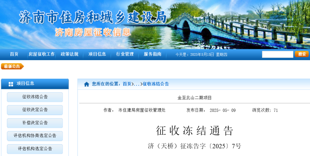 近日,济南市天桥区住房和城乡建设局发布最新征收冻结通告,金至北山二期项目房屋征收范围已经确定。按照有关规定,冻结事项通告如下: