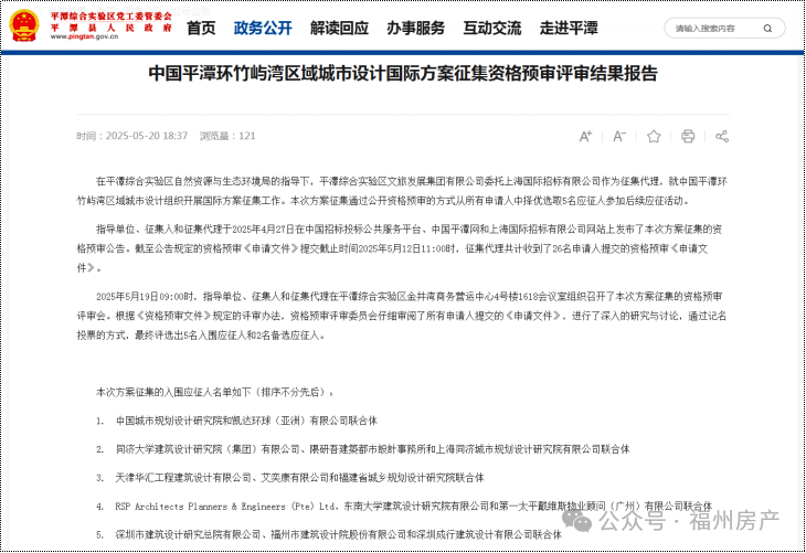 5月20日,平潭综合实验区自然资源与生态环境局发布“中国平潭环竹屿湾区域城市设计国际方案征集资格预审评审结果报告”称,本次方案征集通过公开资格预审的方式从所有申请人中择优选取5名应征人参加后续应征活动。