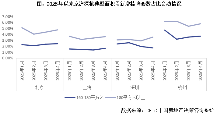 从面积段来看,与以上结论基本类似,北京、上海、杭州虽然160平以上面积段新增挂牌量占比均不足10%,但是从月度变化趋势来看,基本呈现出持稳或稳中有增态势,仅深圳一城160-180平米面积段显著回落。