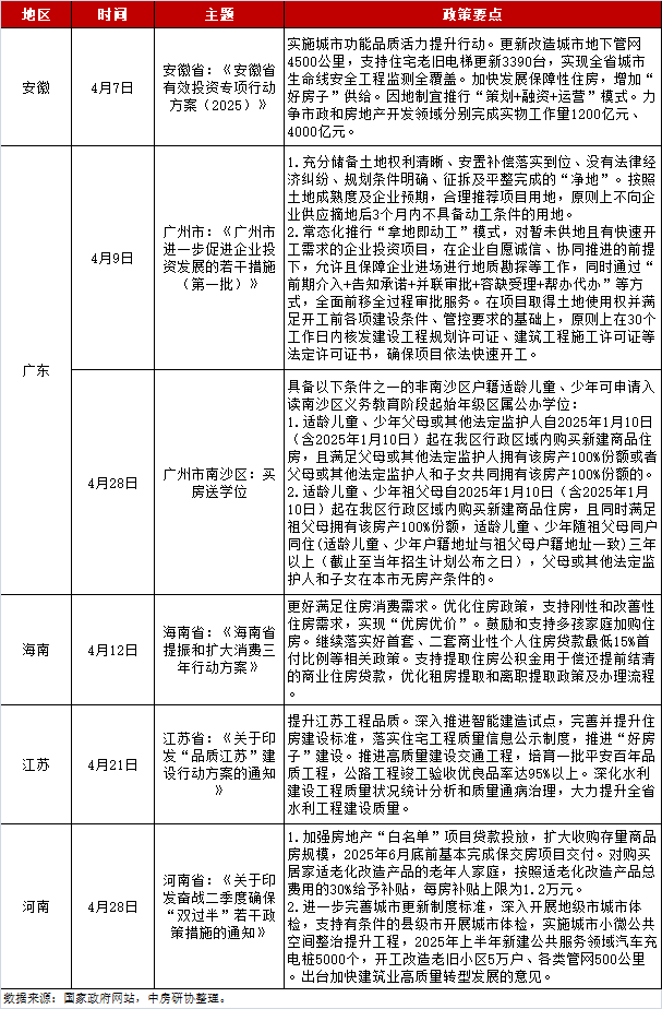 2025年4月,我国房地产政策宽松预期增强。中央层面,政治局会议强调,加大实施城市更新行动,有力有序推进城中村和危旧房改造,加快构建房地产发展新模式,加大高品质住房供给,优化存量商品房收购政策,持续巩固房地产市场稳定态势;金融监管总局发文支持受困房企项目纾困风险,促进房地产市场平稳健康发展等。5月7日,央行、金融监管总局发布一揽子金融政策,为房地产政策进一步优化和市场平稳健康发展创造有利条件。