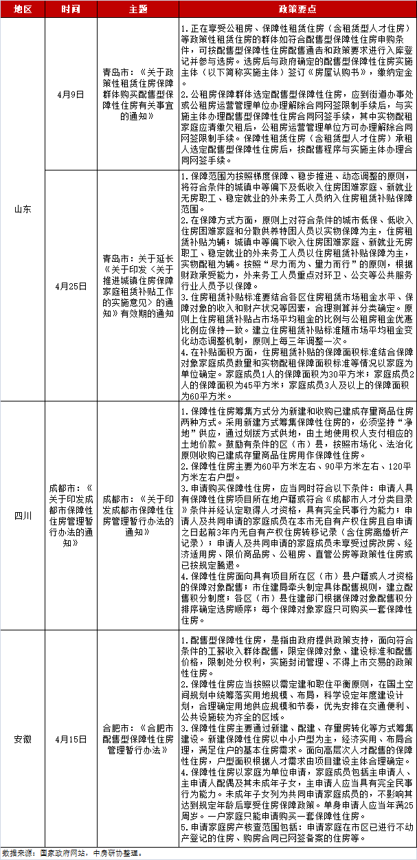 中性政策主要涉及保障性住房规划建设、配售型保障性住房管理等。典型代表有:青岛发布配售型保障性住房购买有关事宜的通知,明确政策性租赁住房保障群体购买配售型保障性住房相关流程和手续,同时,提出延长城镇住房保障家庭租赁补贴期限,其中,符合条件的城市低保、低收入住房困难家庭和分散供养特困人员以实物保障为主,城镇中等偏下收入住房困难家庭、新就业无房职工、稳定就业的外来务工人员以住房租赁补贴保障为主;成都、合肥印发配售型保障性住房管理办法,从保障性住房筹集方式、户型设计、保障群体及配售规则等多方面作出具体规定。