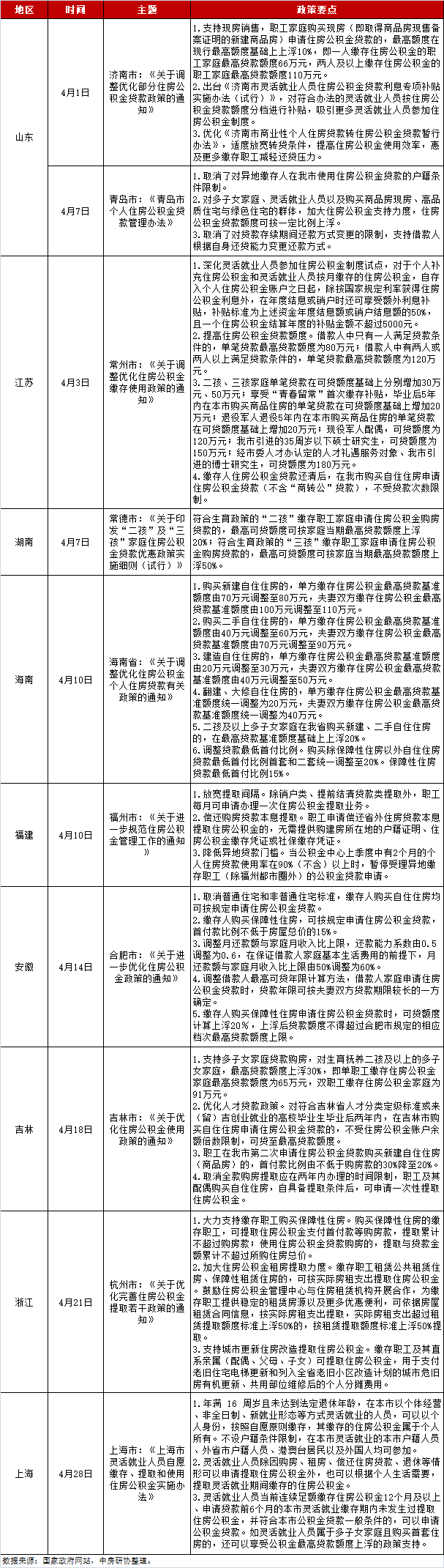 在住房公积金政策支持方面,核心举措主要包括上调公积金最高贷款额度、下调公积金贷款最低首付比例、放宽公积金申请限制等。典型代表有:济南将购买现房住房公积金最高贷款额度上调10%,即单缴存职工家庭最高贷款额度66万元,双缴存职工家庭最高贷款额度110万元;青岛取消异地缴存人在青岛使用住房公积金贷款的户籍条件限制,取消对贷款存续期间还款方式变更的限制,加大对多子女家庭、灵活就业人员以及购买商品房现房、高品质住宅及绿色住宅群体的住房公积金支持力度;常州将单缴存职工家庭最高贷款额度提高至80万元,双缴存职工家庭最高贷款额度提高至120万元;海南将购买新房的单缴存职工家庭最高贷款额度提高至80万元,双缴存职工家庭最高贷款额度提高至110万元,购买二手住房的单缴存职工家庭最高贷款额度提高至60万元,双缴存职工家庭最高贷款额度提高至90万元,同时,将保障性住房以外自住住房最低首付比例首套和二套统一调整至20%,保障性住房最低首付比例15%等。