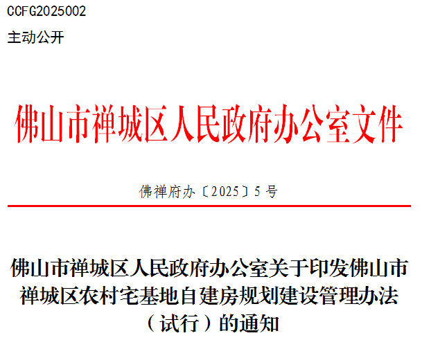 日前,禅城区政府网站发布了《关于印发佛山市禅城区农村宅基地自建房规划建设管理办法(试行)的通知》,明确新规将于6月25日正式实施。