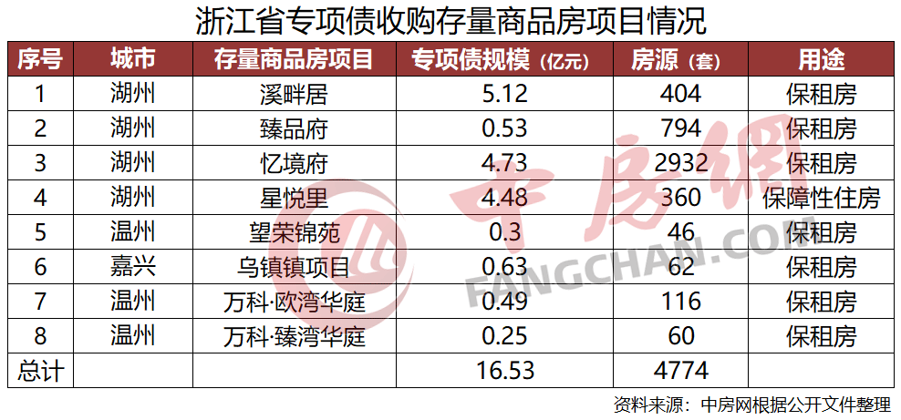 其中,湖州4个项目获专项债融资14.86亿元,接近此次专项债支持收购存量商品房项目融资总额的九成。此外,温州3个项目获专项债融资1.04亿元,嘉兴桐乡市1个项目获0.63亿元专项债资金支持。