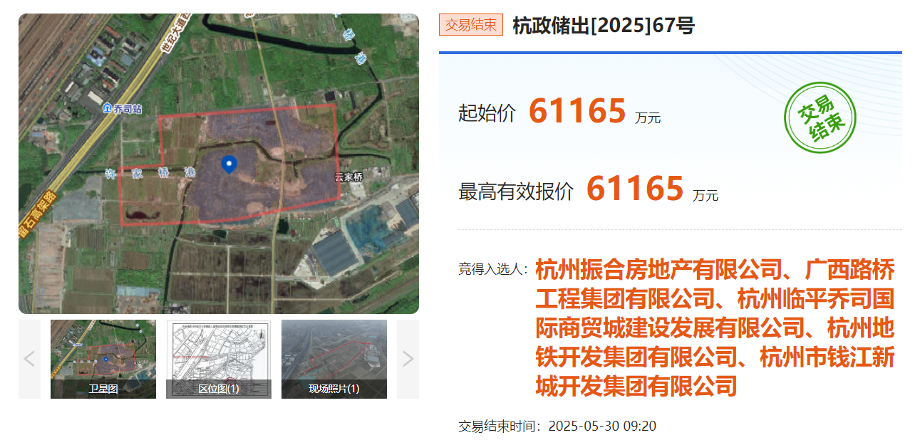 两宗地均被杭州振合&广西路桥工程&乔司国际商贸城建设&杭铁开发&钱新开发以底价拿下,楼面价分别为4544、3624元/㎡,总成交价约11亿元。