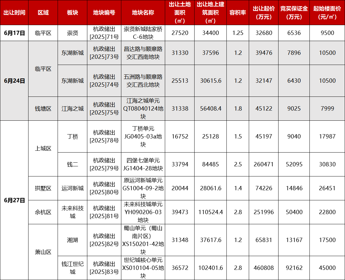 6月杭州计划出让宅地信息表