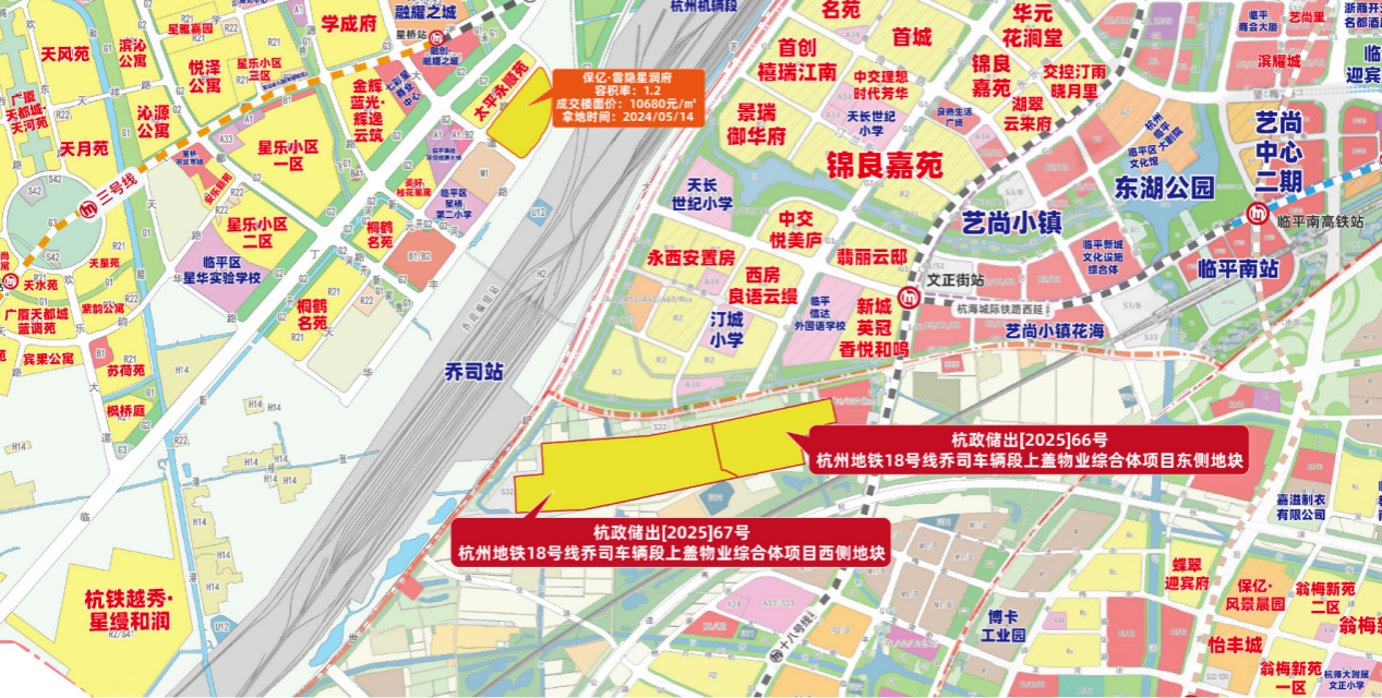 5月30日,杭州临平区的地铁18号线乔司车辆段上盖物业综合体项目的2宗姊妹地成功出让。