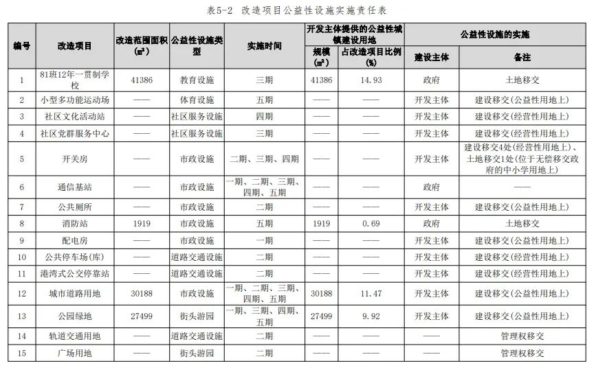从其改造项目实施责任表可见,规划的81班12年制学校,实施时间:第三期,也就是说最快2027年开建,建设主体为政府。