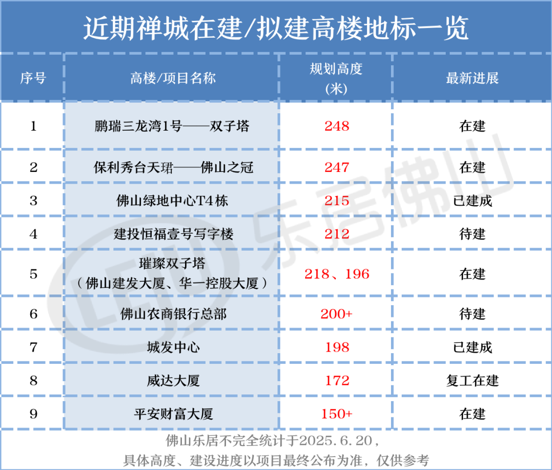 此外,约247米的佛山之冠正在建设中,截止今年6月初,建设高度已过半。