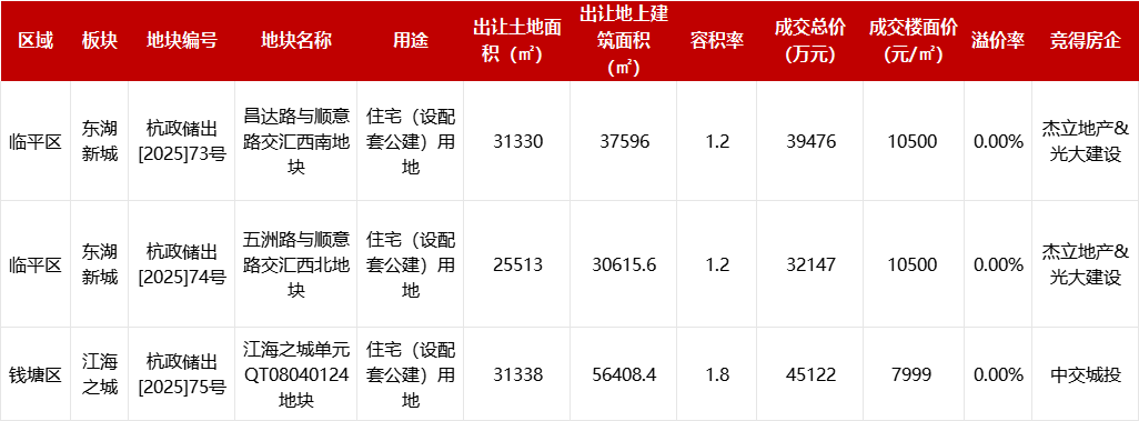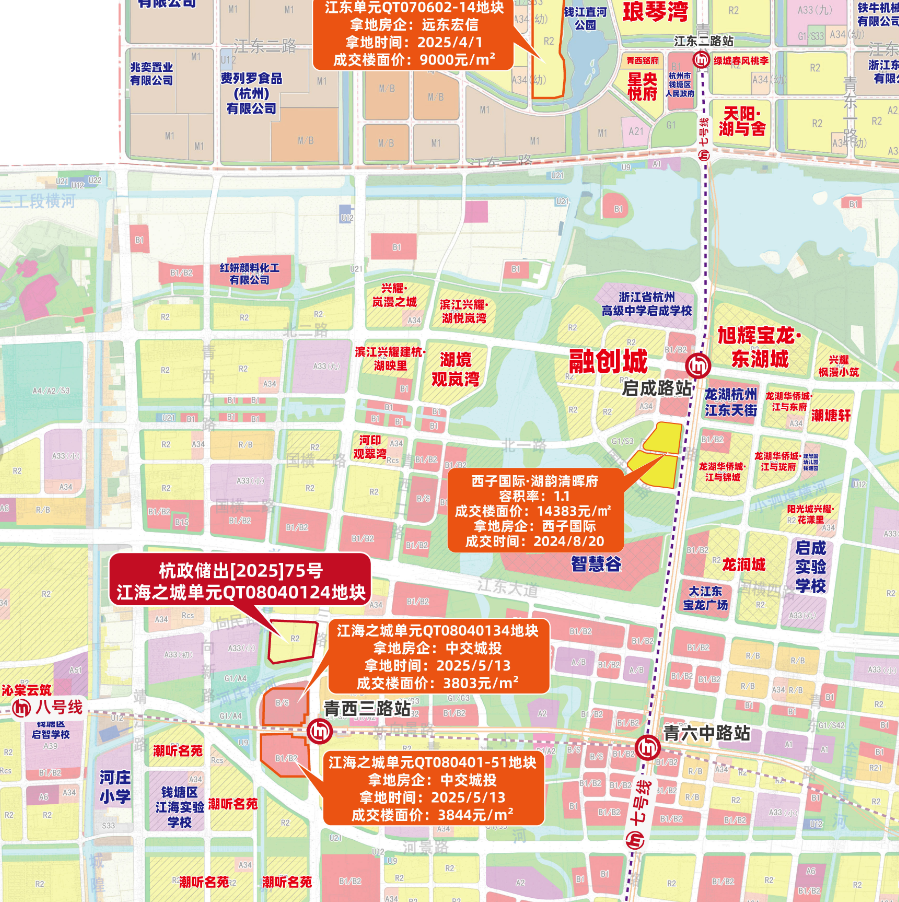钱塘区青山西路TOD旁的低密宅地,则被中交城投以底价拿下,楼面价7999元/㎡。
