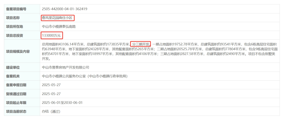 这也是小榄首宗四代宅用地,拿地当天即备案,备案名为春风里花园商住小区,总投资13.3亿,规划建15栋高层住宅,分三期开发【详情】。