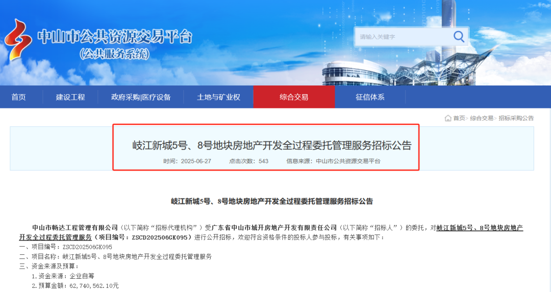 6月27日,中山公共资源交易平台发布一则关于《岐江新城5号、8号地块房地产开发全过程委托管理服务招标公告》。