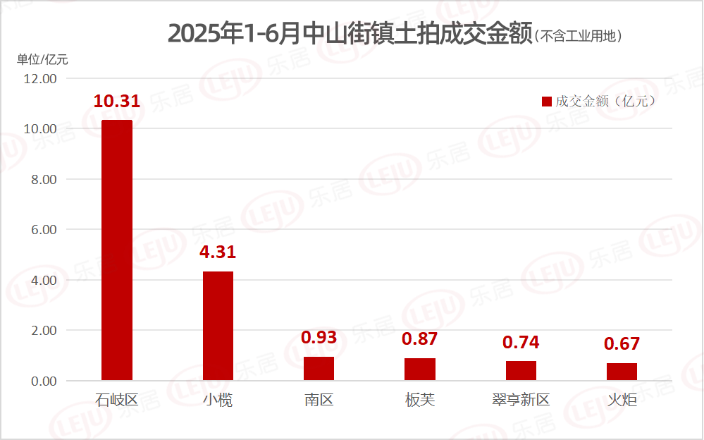 土拍成交金额方面,石岐区最高,上半年石岐区共成交3宗宅地,总成交金额约10.31亿元;其次是小榄镇,成交1宗住宅用地,成交金额约4.31亿元;其他街镇成交金额均为过亿,具体见下图。