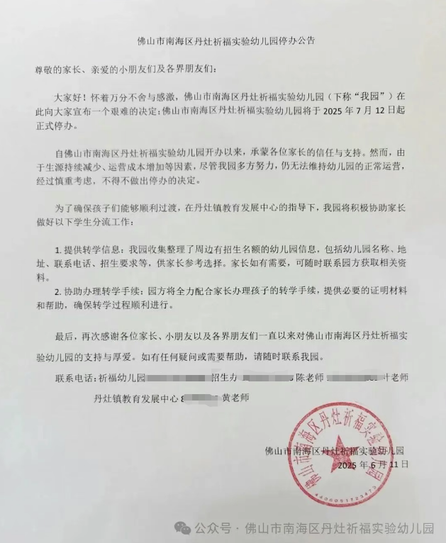 园方公告称,由于生源持续减少、运营成本增加等因素,尽管我园多方努力,仍无法维持幼儿园的正常运营,经过慎重考虑,不得不做出停办的决定,幼儿园将于2025年7月12日起正式停办。