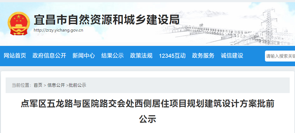 近日,宜昌市自然资源和城乡建设局官网批前公示,点军区五龙路与医院路交会处西侧居住项目规划建筑设计方案曝光。