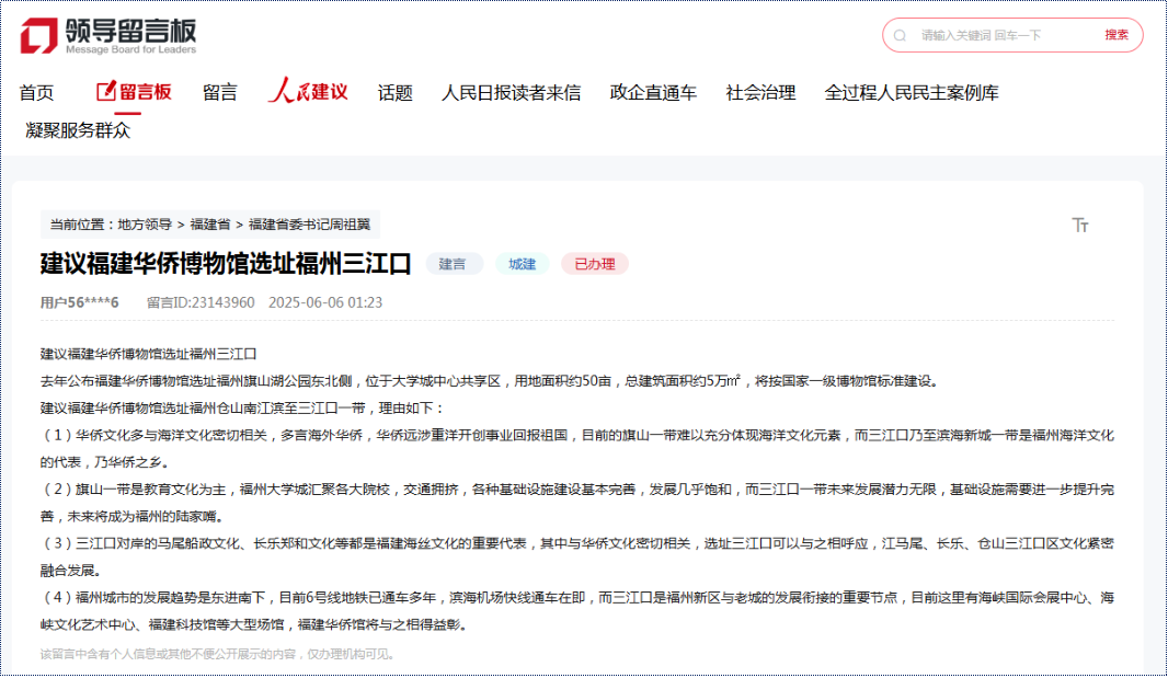 今年6月,有网友在人民网领导留言板留言:去年公布福建华侨博物馆选址福州旗山湖公园东北侧,位于大学城中心共享区,用地面积约50亩,总建筑面积约5万㎡,将按国家一级博物馆标准建设。建议将福建华侨博物馆选址移到福州仓山南江滨至三江口一带。
