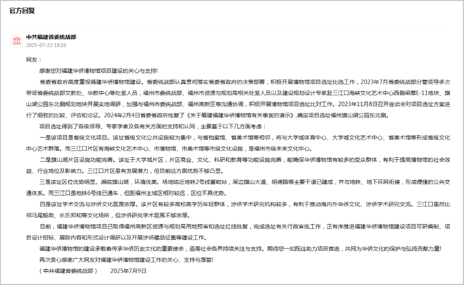 7月22日,省委统战部回复表示,2023年7月省委统战部分管领导多次带领省委统战部文教处、华教中心等处室人员,福州市委统战部、福州市资源与规划局相关处室人员以及建设规划设计专家赴三江口海峡文化艺术中心西侧梁厝E-11地块、旗山湖公园东北侧规划地块开展实地调研,加强与福州市委统战部、福州高新区等沟通协调,积极开展博物馆项目选址比对工作。