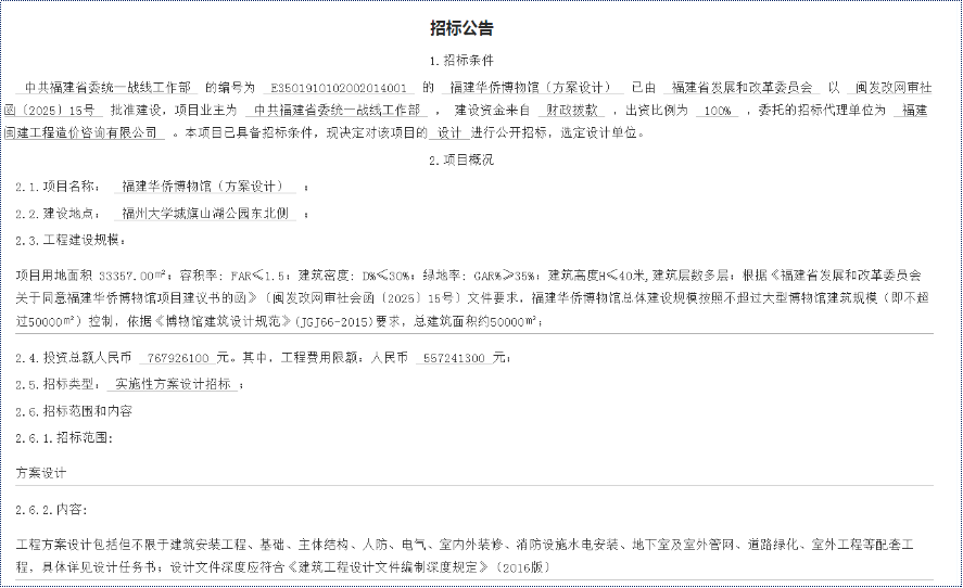 今年5月9日,福州市公共资源交易网发布“福建华侨博物馆(方案设计)-招标公告”。