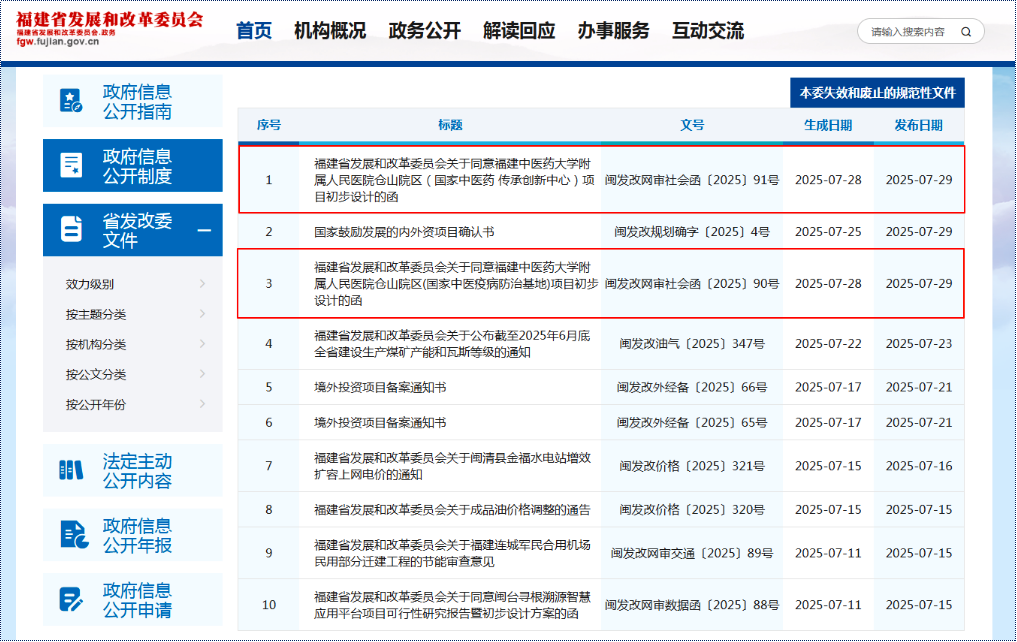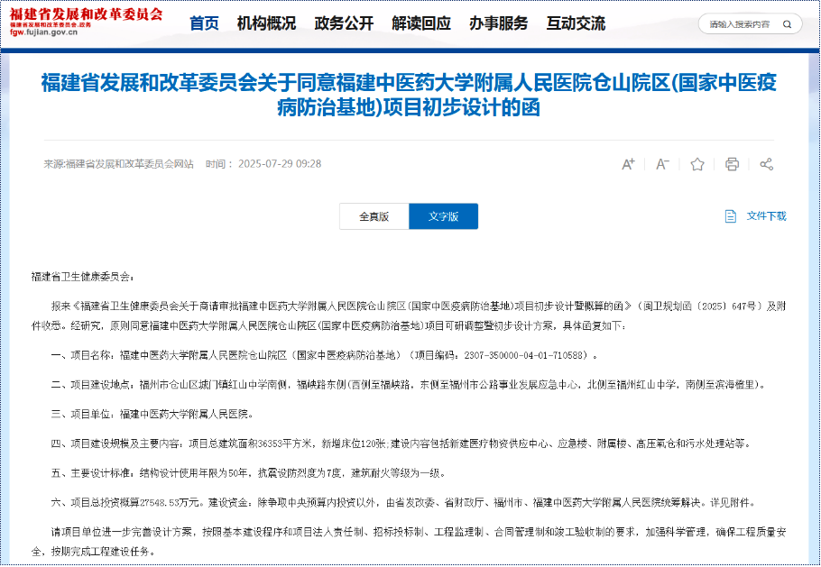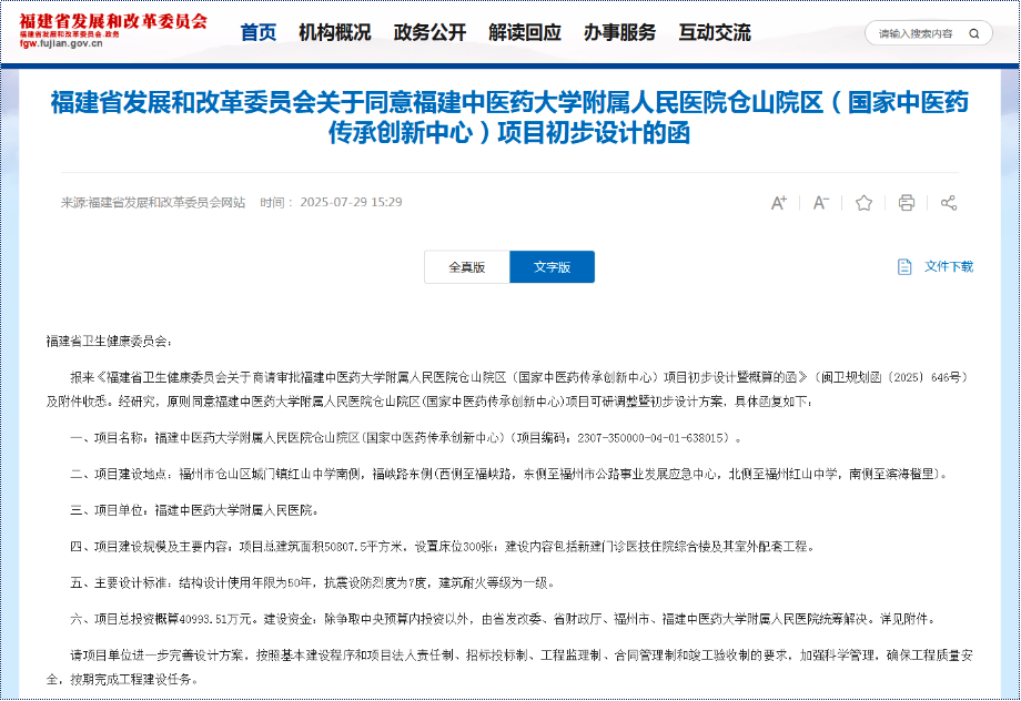 7月28日,福建省发展和改革委员会发布《关于同意福建中医药大学附属人民医院仓山院区(国家中医药传承创新中心、国家中医疫病防治基地)项目初步设计的函》,原则同意两个项目可研调整暨初步设计方案。