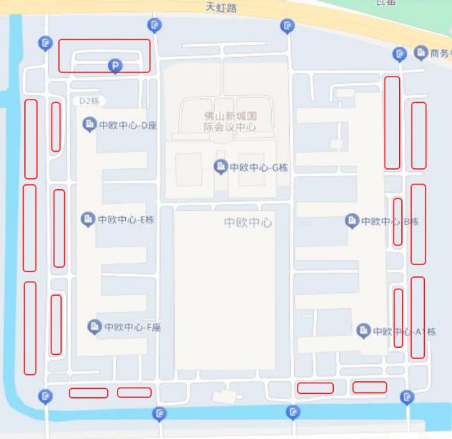 可导航搜索“佛山新城中欧中心E栋”。E栋附近地面停车位如下图所示(红色方框区域)。