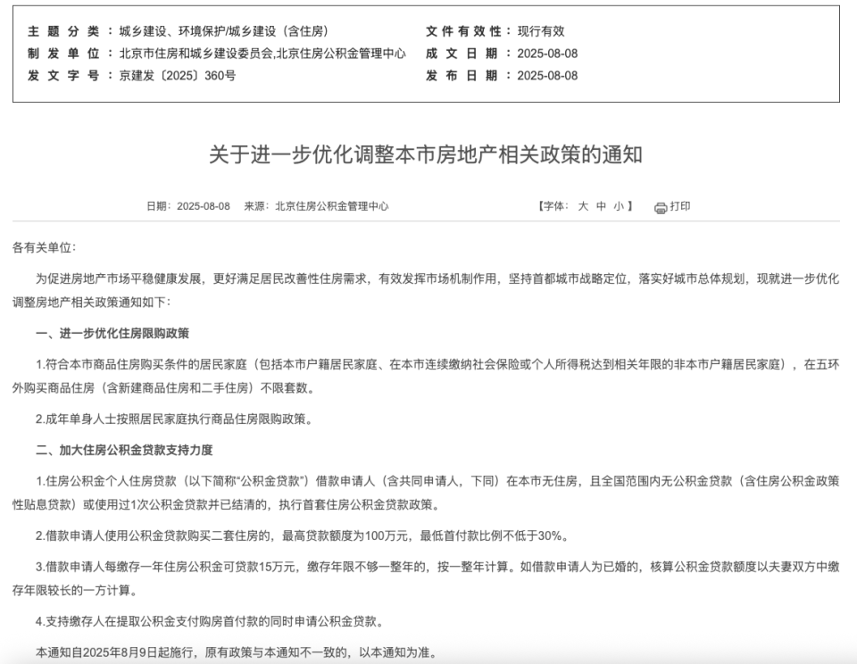 2025年8月8日,北京市住房和城乡建设委员会发布《关于进一步优化调整本市房地产相关政策的通知》,主要内容包括两个部分,一是进一步优化住房限购政策,二是加大住房公积金贷款支持力度。